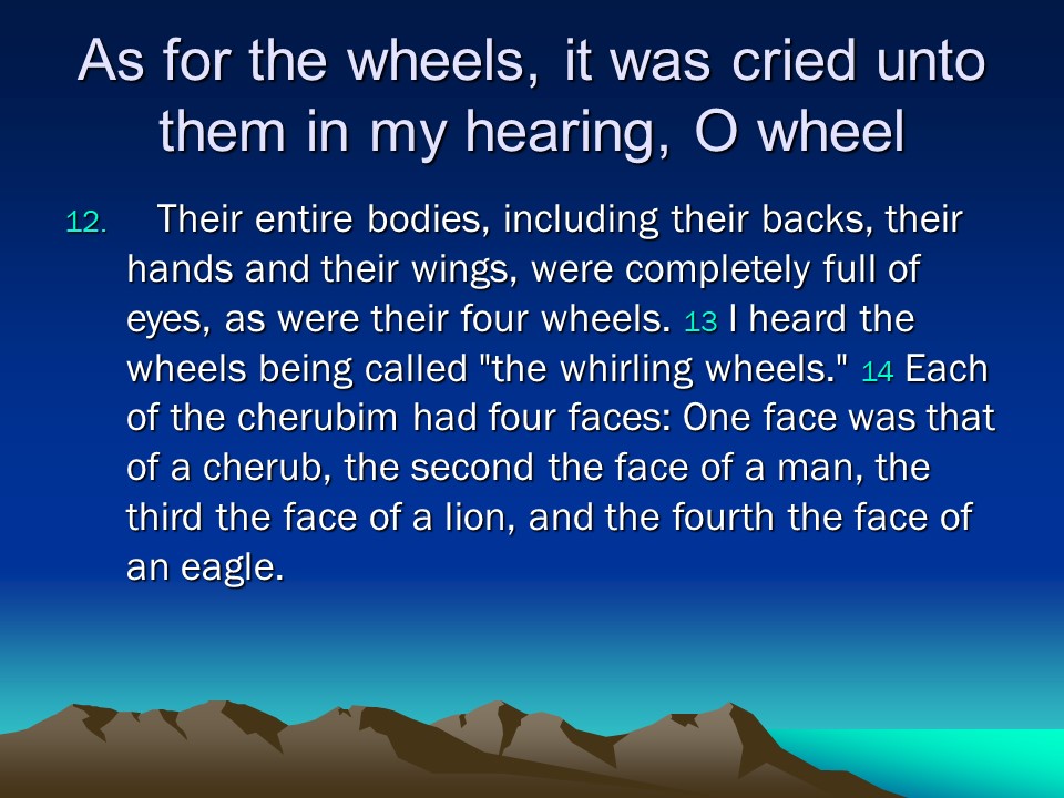 Ezekiel 10. The vision God gave Ezekiel continued with him seeing the same whirling wheels as in Ezekiel 1, and while they were hovering over Jerusalem, the Glory of God departed from the Temple.