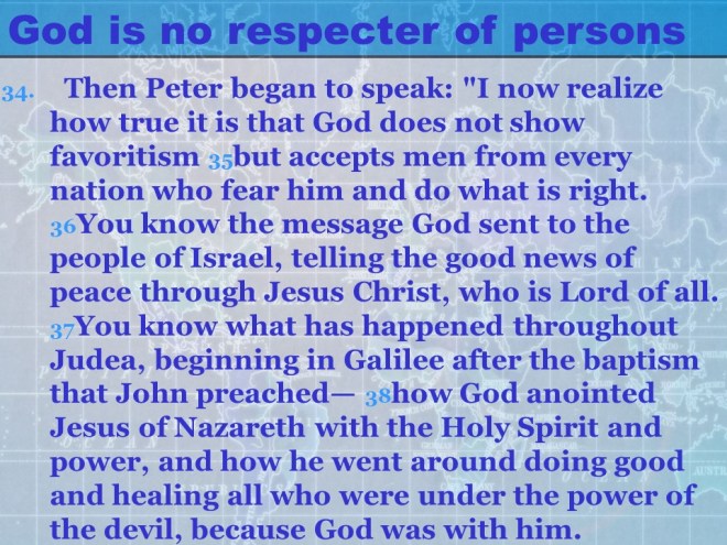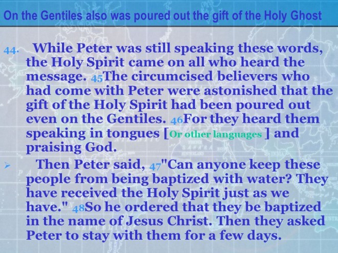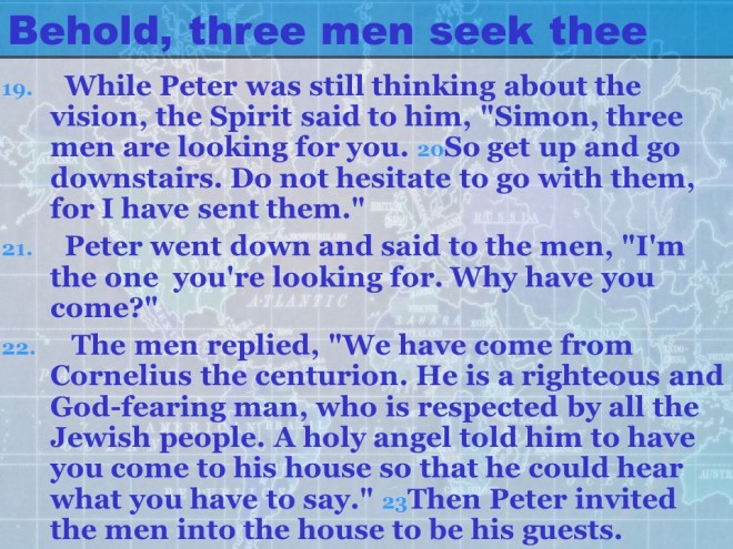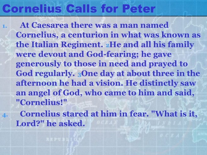 Acts 10, Cornelius calls for Peter, Peter’s vision, from Joppa to Caesarea, Peter meets Cornelius, the Gospel presented to Cornelius’ Household, the Holy Spirit falls on the Gentiles. Acts 10, Cornelius calls for Peter, Peter’s vision, from Joppa to Caesarea, Peter meets Cornelius, the Gospel presented to Cornelius’ Household, the Holy Spirit falls on the Gentiles.
