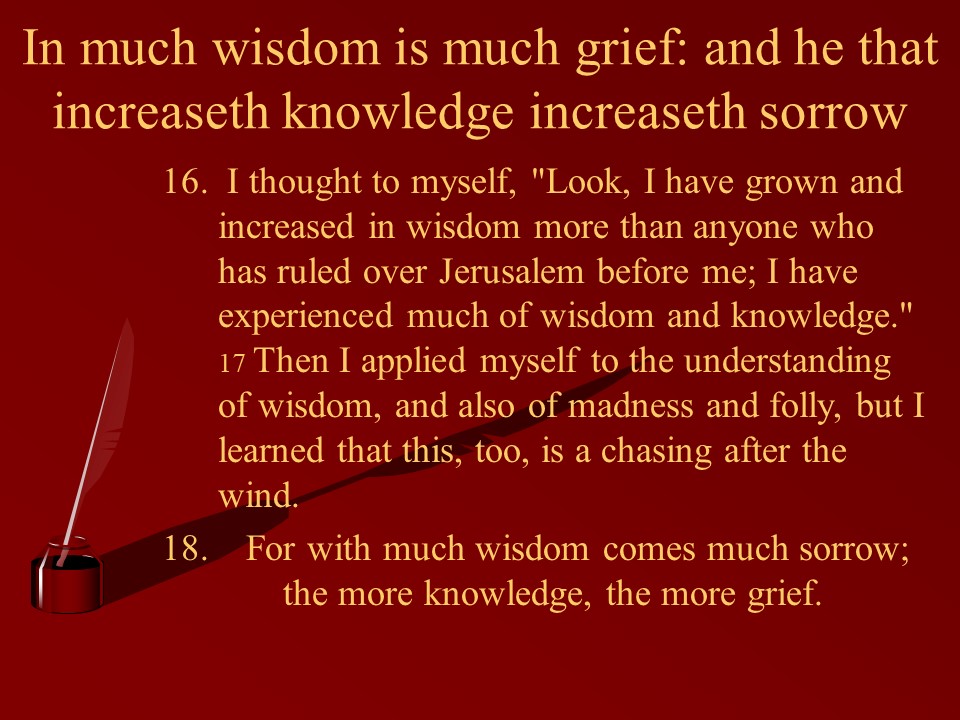 Ecclesiastes 1. The author, king Solomon spoke of the vanity of life and the grief of wisdom.