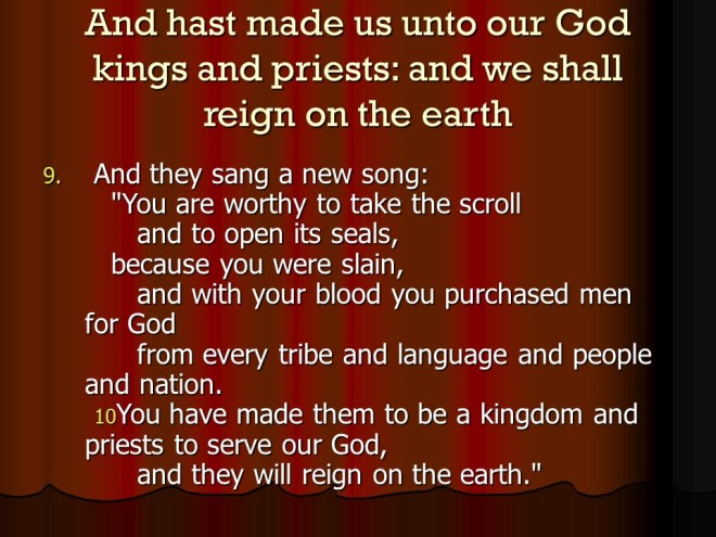 Revelation 5. Worship is continued in heaven and the Apostle John saw a scroll with seven seals. Nobody but the Lamb was worthy to take and open the scroll. All that were present broke out in praise, singing a new song, saying, “Thou art worthy to take the book, and to open the seals thereof: for thou wast slain, and hast redeemed us to God by thy blood” and “Blessing, and honour, and glory, and power, be unto him that sitteth upon the throne, and unto the Lamb for ever and ever.  And the four beasts said, Amen. And the four and twenty elders fell down and worshipped him that liveth for ever and ever.