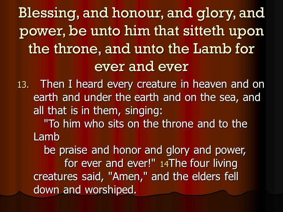 Revelation 5. Worship is continued in heaven and the Apostle John saw a scroll with seven seals. Nobody but the Lamb was worthy to take and open the scroll. All that were present broke out in praise, singing a new song, saying, “Thou art worthy to take the book, and to open the seals thereof: for thou wast slain, and hast redeemed us to God by thy blood” and “Blessing, and honour, and glory, and power, be unto him that sitteth upon the throne, and unto the Lamb for ever and ever.  And the four beasts said, Amen. And the four and twenty elders fell down and worshipped him that liveth for ever and ever.