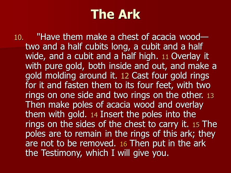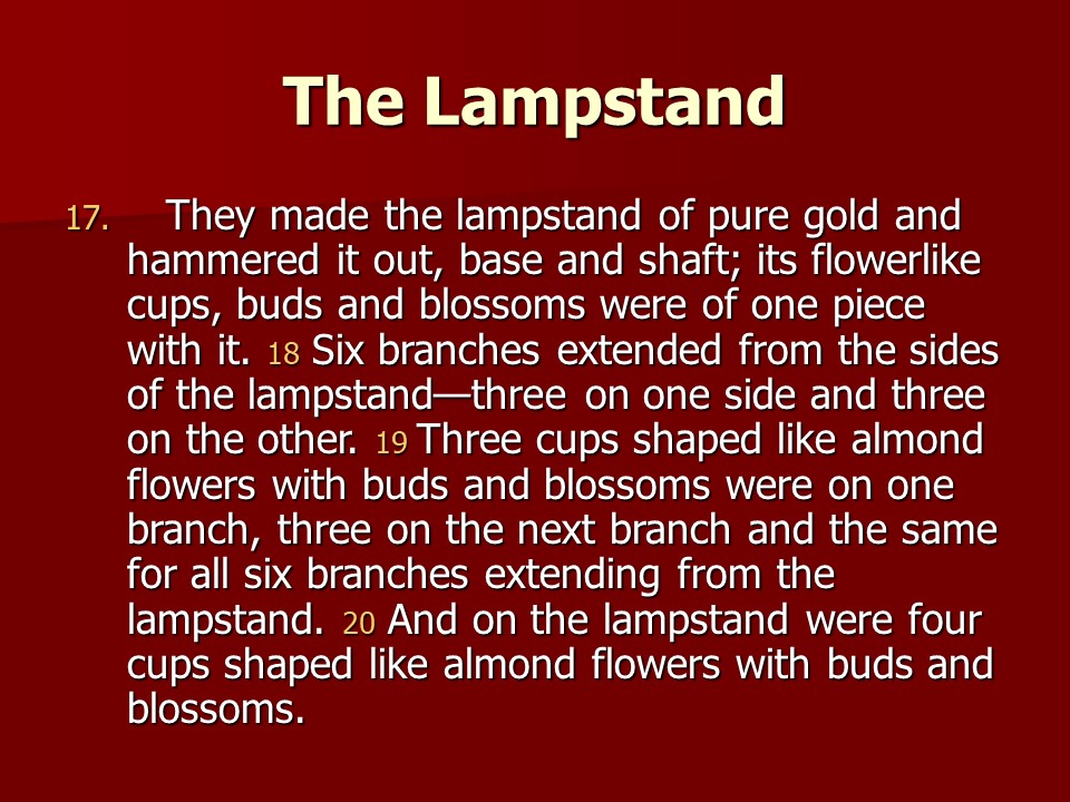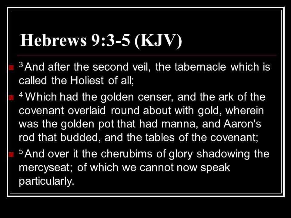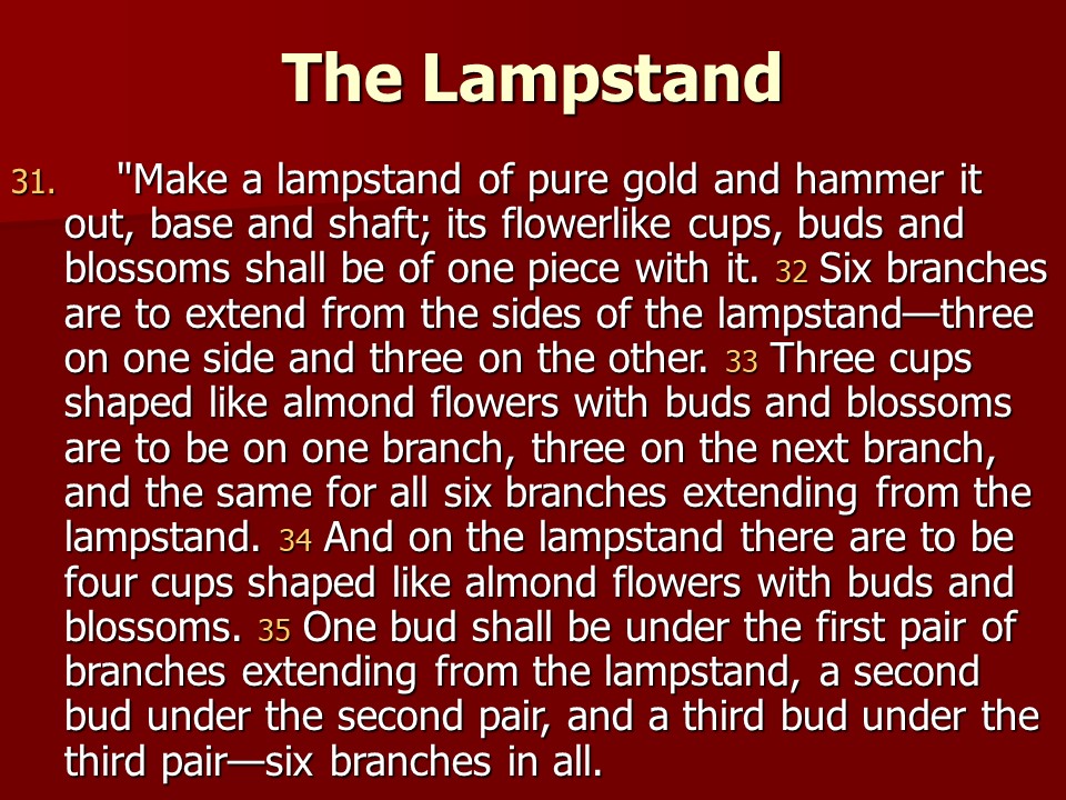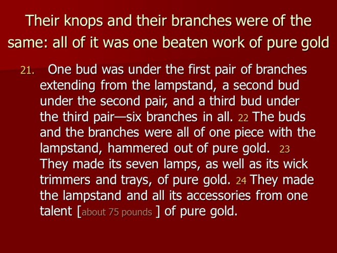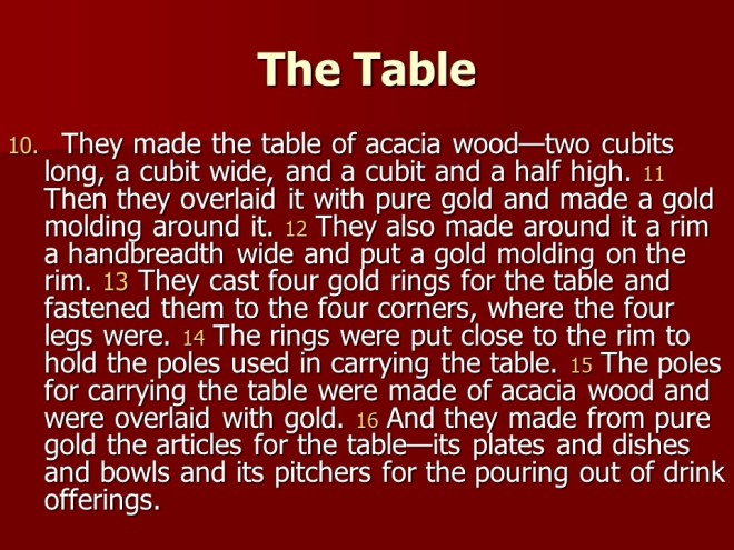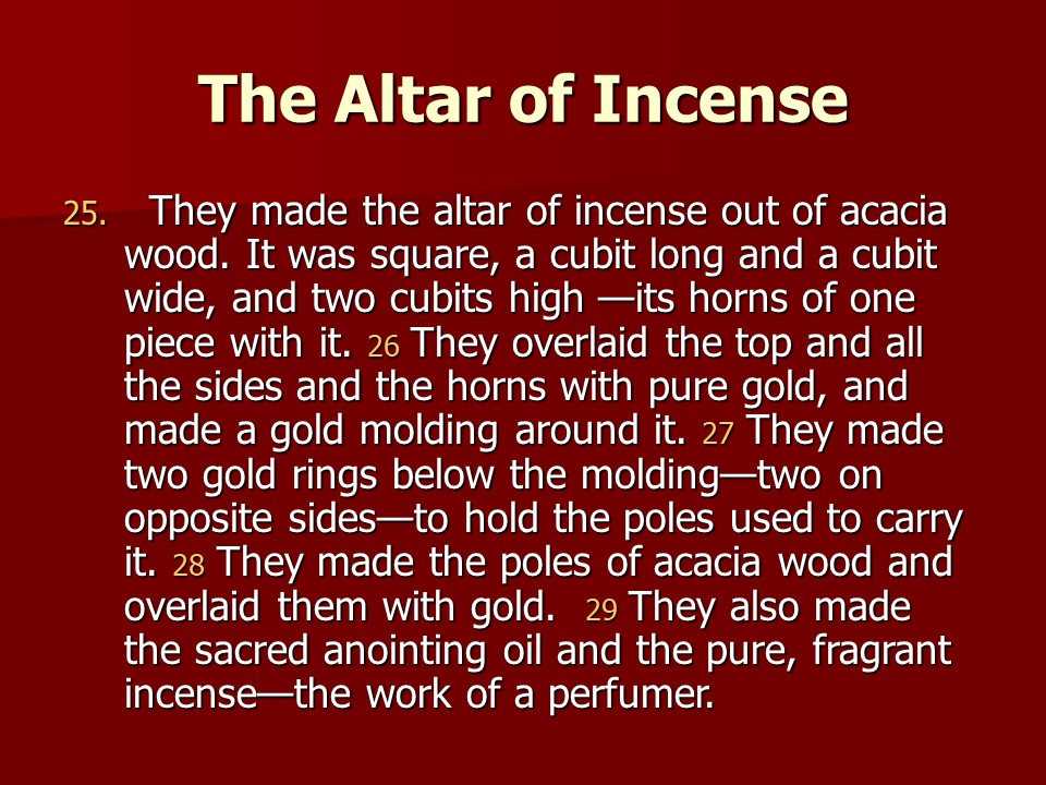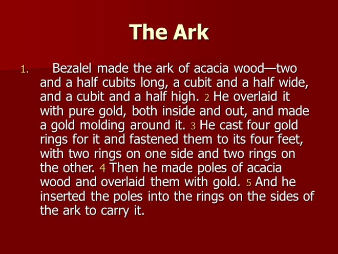 Exodus 37 continues describing how the Ark of the Covenant was built with its cherubim,( by necessity very sketchy since nobody would be allowed to see them once they were made,) the table, the lampstand and the altar of incense.