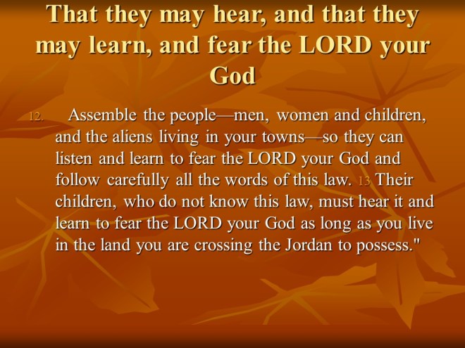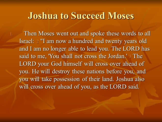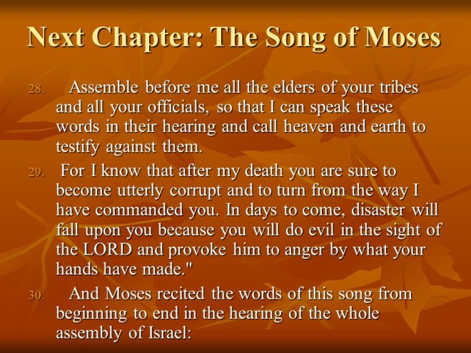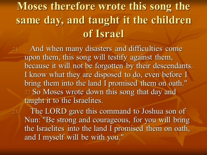 Deuteronomy 31 Moses declared Joshua to be the new leader of Israel, “Be strong and of good courage”. The Law was to be read every seven years, Israel’s rebellion was predicted and, as a reminder Moses recorded his song, which is recited in the next chapter.