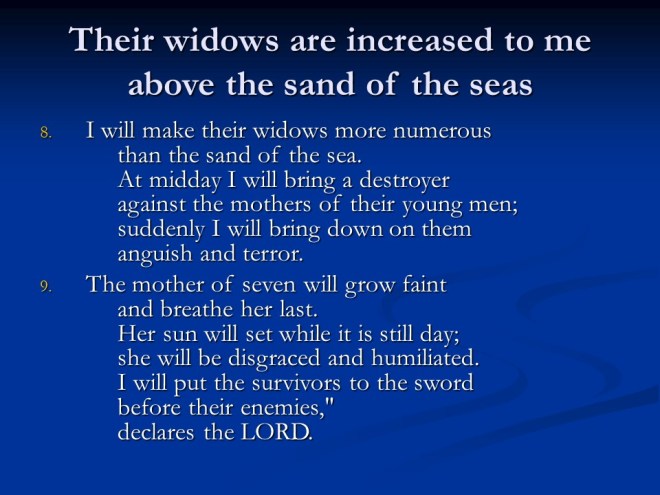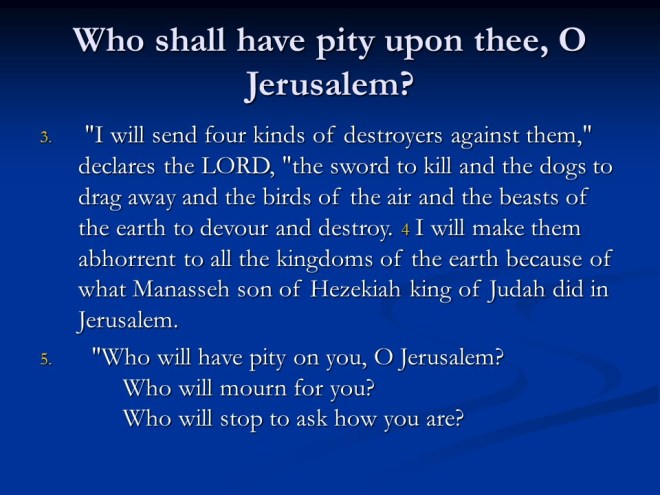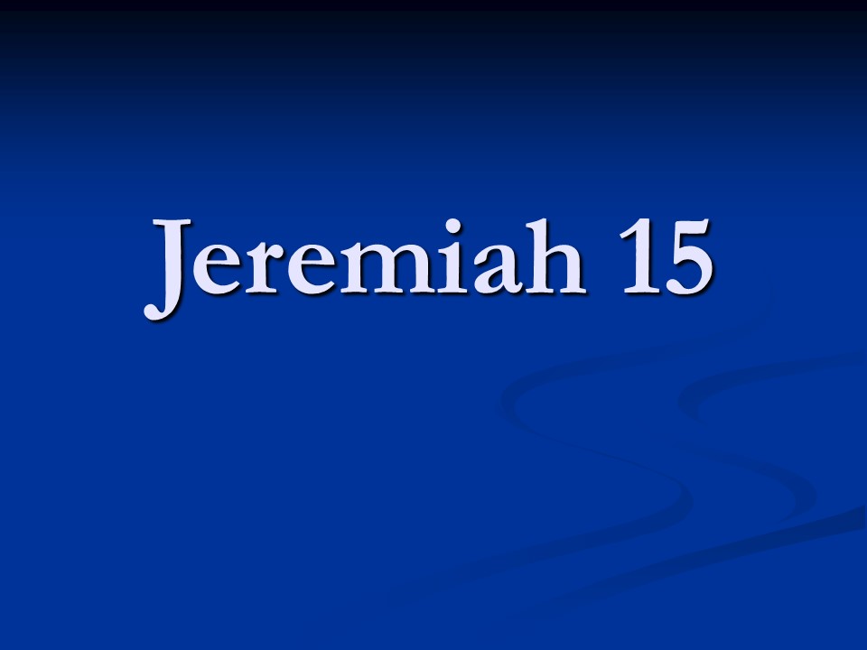 Jeremiah 15. More calamities awaited the people, for the LORD will not relent. The Prophet Jeremiah felt dejected, but the Lord reassured him.