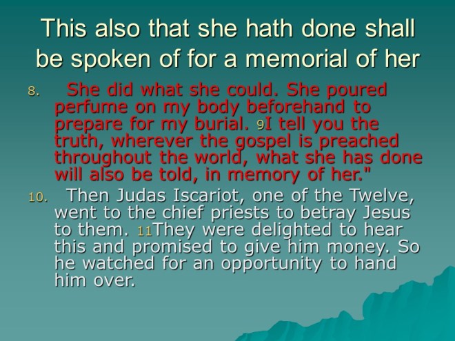 1 Corinthians 11. This chapter starts out with a long dissertation ending with “if a woman have long hair, it is a glory to her: for her hair is given her for a covering.” It continues with desired conduct at the Lord’s Supper and the very institution of the Lord’s Supper. Examine yourself so you may participate in a worthy manner.
