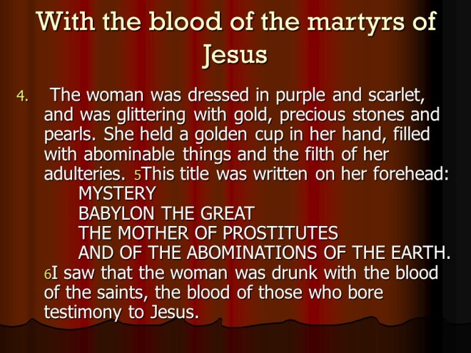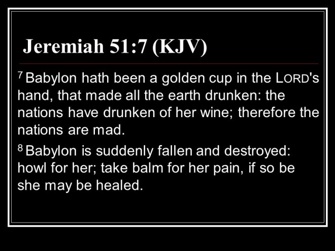 Revelation 17. So begins the telling of the fall of Babylon. It is not Rome, nor is it Roman Catholicism. In my opinion it is the coalition of communism, socialism, Islam and social justice Christianity in the form of Globalism and implementing Global Governance. This is represented by the scarlet woman and the scarlet basket. The meaning of the woman and the basket is then explained in prophecy. (Feel free to interpret the prophesies otherwise).