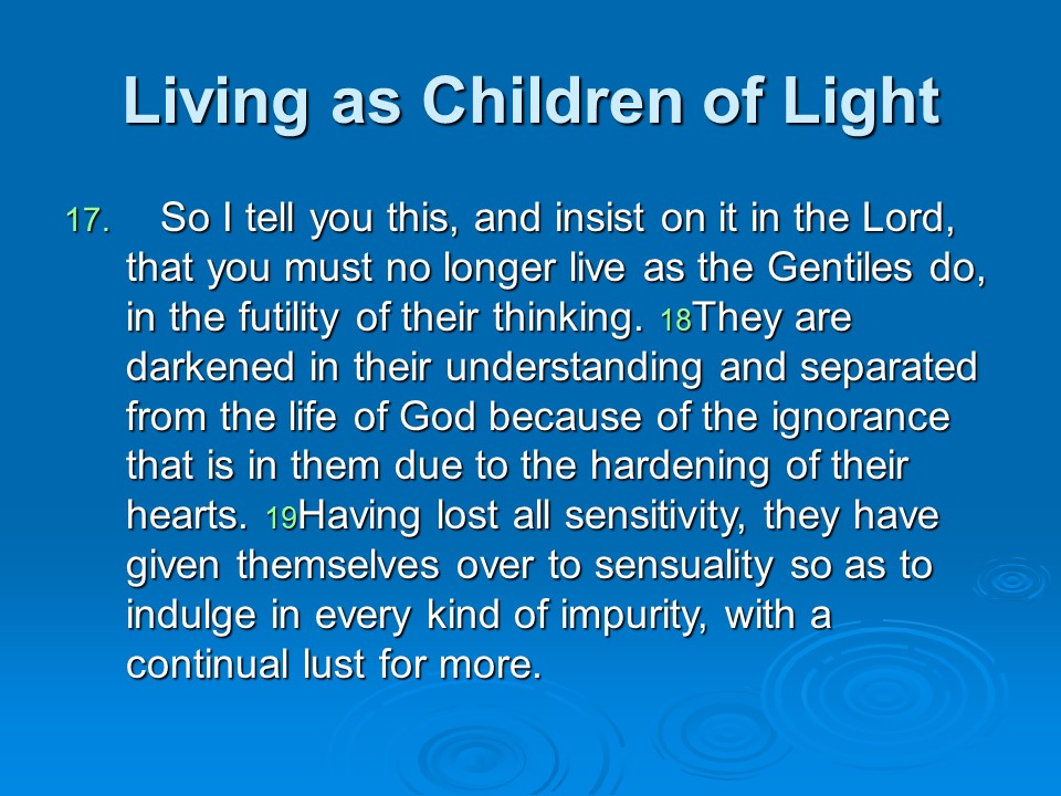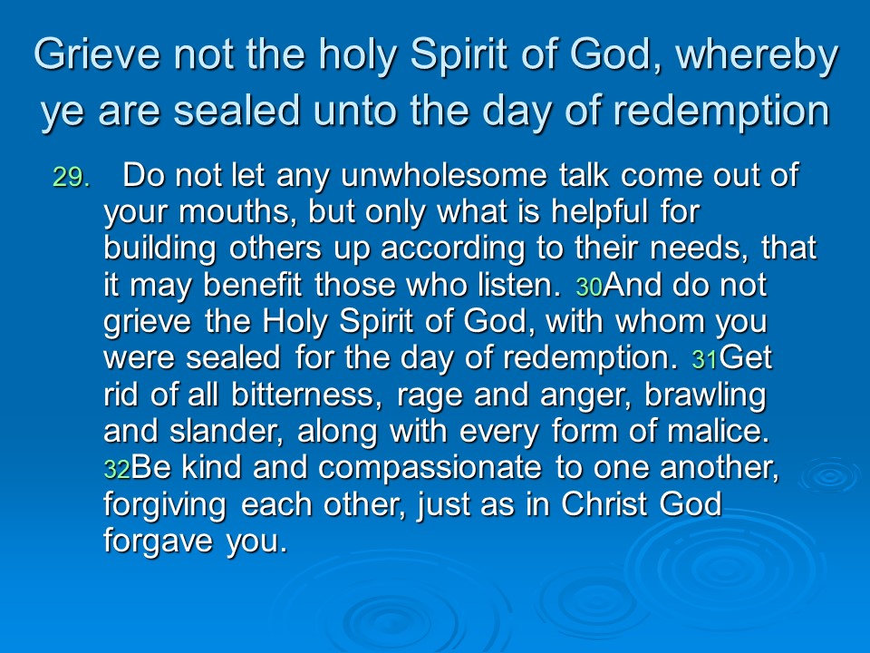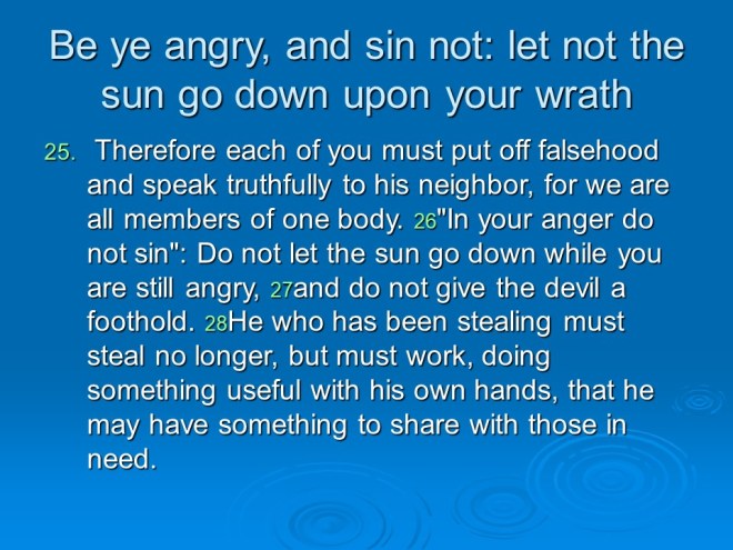 Ephesians 4:17-32. The Apostle Paul reminded the Ephesians they are children of light, do not grieve the spirit, and “do not let the sun go down on your wrath“.