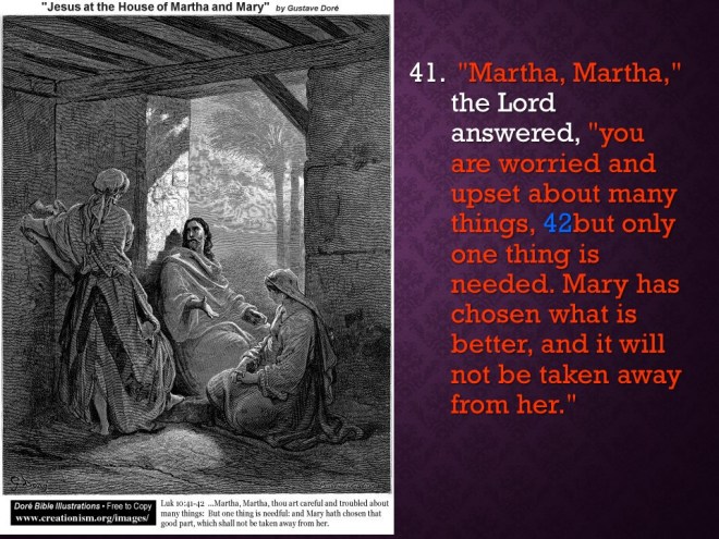 Luke 10:25-42. Jesus told the Parable of the Good Samaritan. Further on his way Jesus went to the home of Martha and Mary. Martha was busy preparing the meal, but Mary just sat there and listened to Jesus.