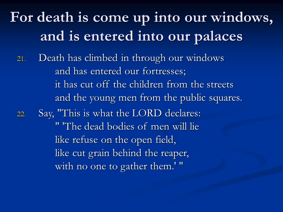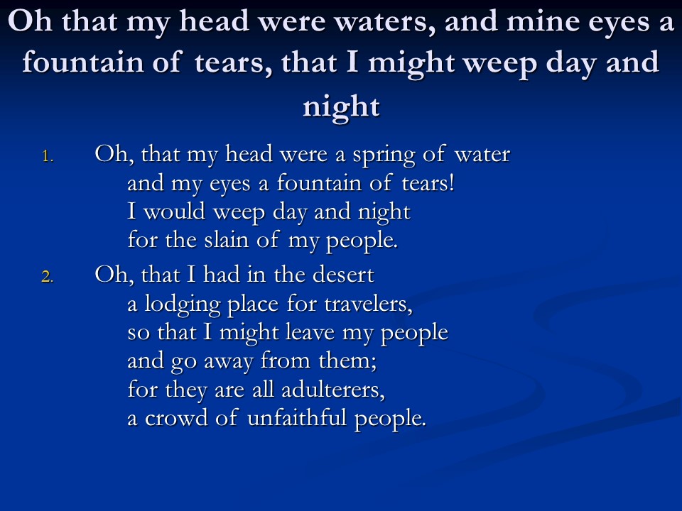 Jeremiah 9. “The weeping prophet” Jeremiah mourned for the people and the people mourned as they received judgment.