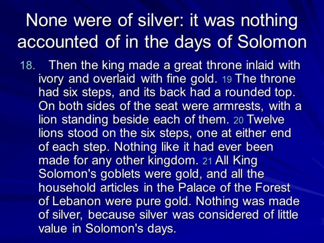 In 1 Kings 10 the Queen of Sheba visited Solomon and praised him “The half had not been told”; of Solomon’s great wisdom and wealth.