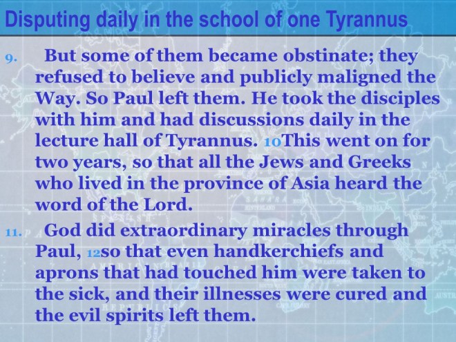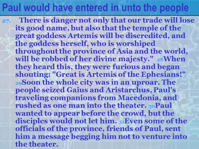 Acts 19:23-41. The tradesmen of Ephesus, who made souvenirs in the form of shrines and idols of silver considered the Apostle Paul and the many believers bad for business. After all, Ephesus was the idol worship center of Artemis (Diana). This led to the riot at Ephesus.