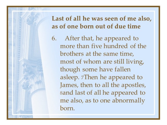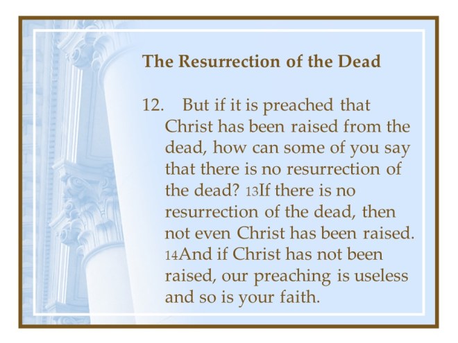 1 Corinthians 15:1-34. In this great resurrection chapter the Apostle Paul spoke of the risen Christ: Faith’s reality, the risen Christ: Our hope, the last enemy destroyed, the error of denying the resurrection, the glorious body and our final victory!