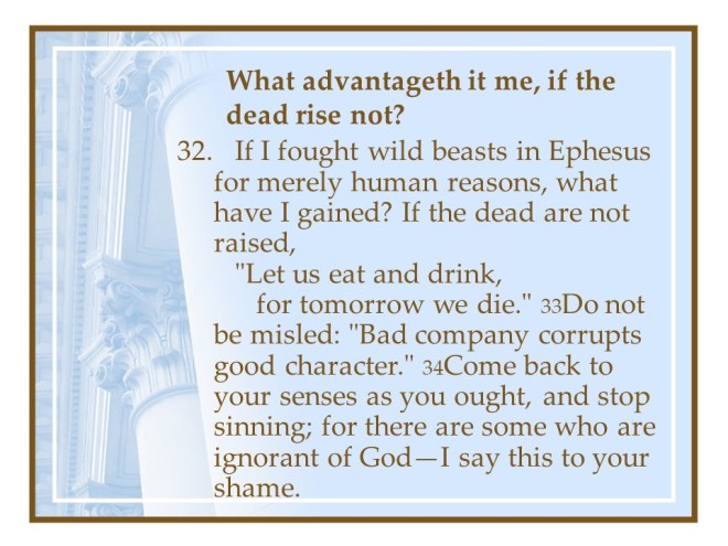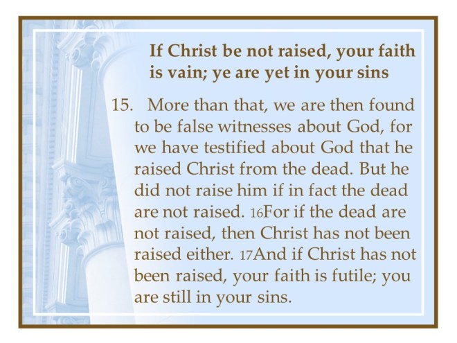 1 Corinthians 15:1-34, the Risen Christ: Faith’s Reality, the Risen Christ: Our Hope, the Last Enemy Destroyed, the Error of Denying the Resurrection.