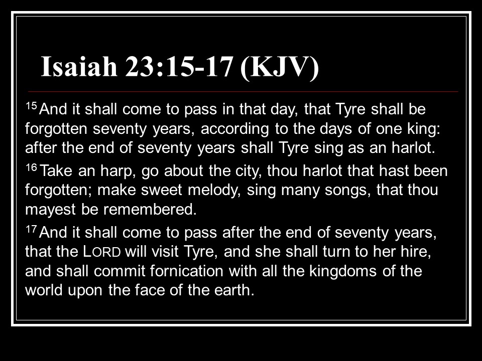 Revelation 17. So begins the telling of the fall of Babylon. It is not Rome, nor is it Roman Catholicism. In my opinion it is the coalition of communism, socialism, Islam and social justice Christianity in the form of Globalism and implementing Global Governance. This is represented by the scarlet woman and the scarlet basket. The meaning of the woman and the basket is then explained in prophecy. (Feel free to interpret the prophesies otherwise).