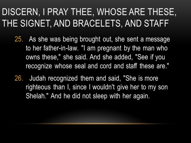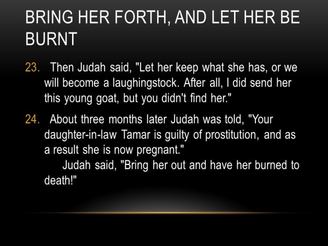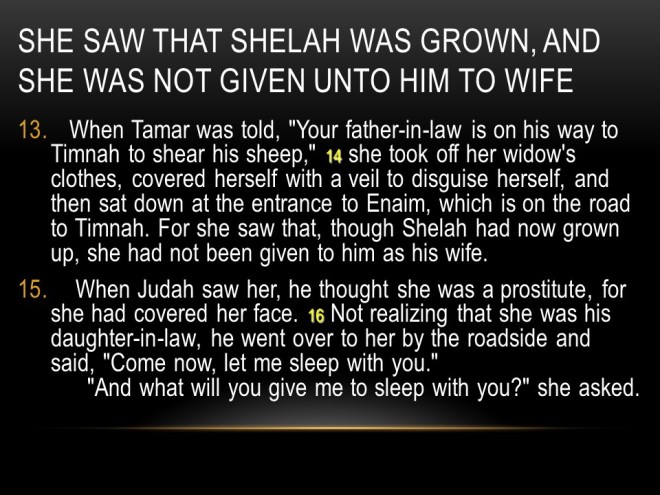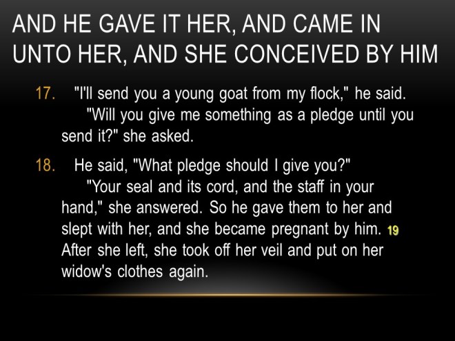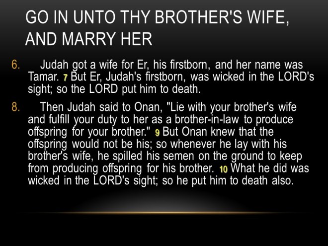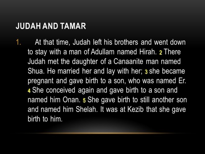 Genesis 38 tells the story of Judah and Tamar. One of the rules of the Old Testament is that if a man dies without producing an heir, it was the duty of his brother to try to produce an offspring to his widow. Onan shirked this responsibility, and that was the sin of Onan. Tamar was thus still barren, so she tricked Judah into committing adultery. You can read it for yourself. Judah finally confessed: “She is more righteous than I.”