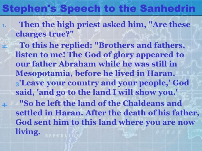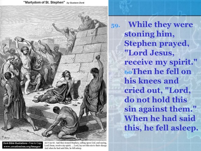 Acts 7 begins with Stephen’s speech to the Sanhedrin and ends with the stoning of Stephen, the first martyr killed for his Christian faith.