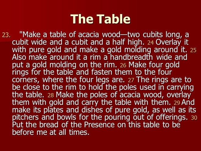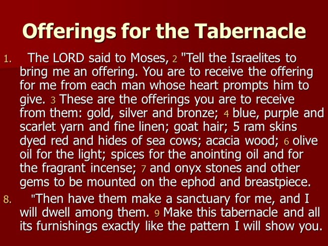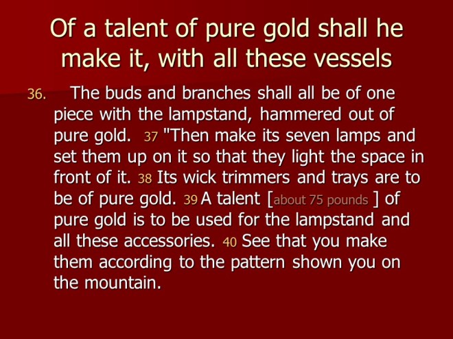Exodus25, offerings for the Tabernacle,the Ark, the Table, the Lampstand. Exodus 25, offerings for the Tabernacle,the Ark, the Table, the Lampstand. A talent of pure gold at today’s rate (Feb. 2020) is about 1.8 million dollars of pure gold.