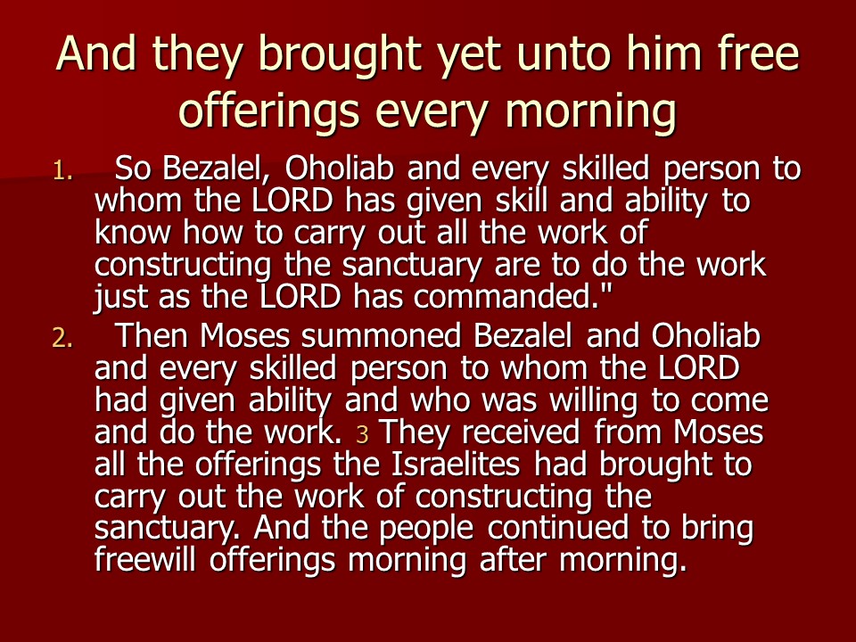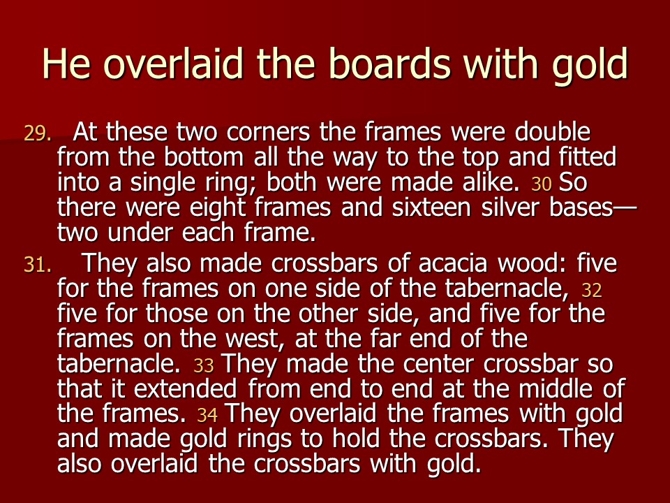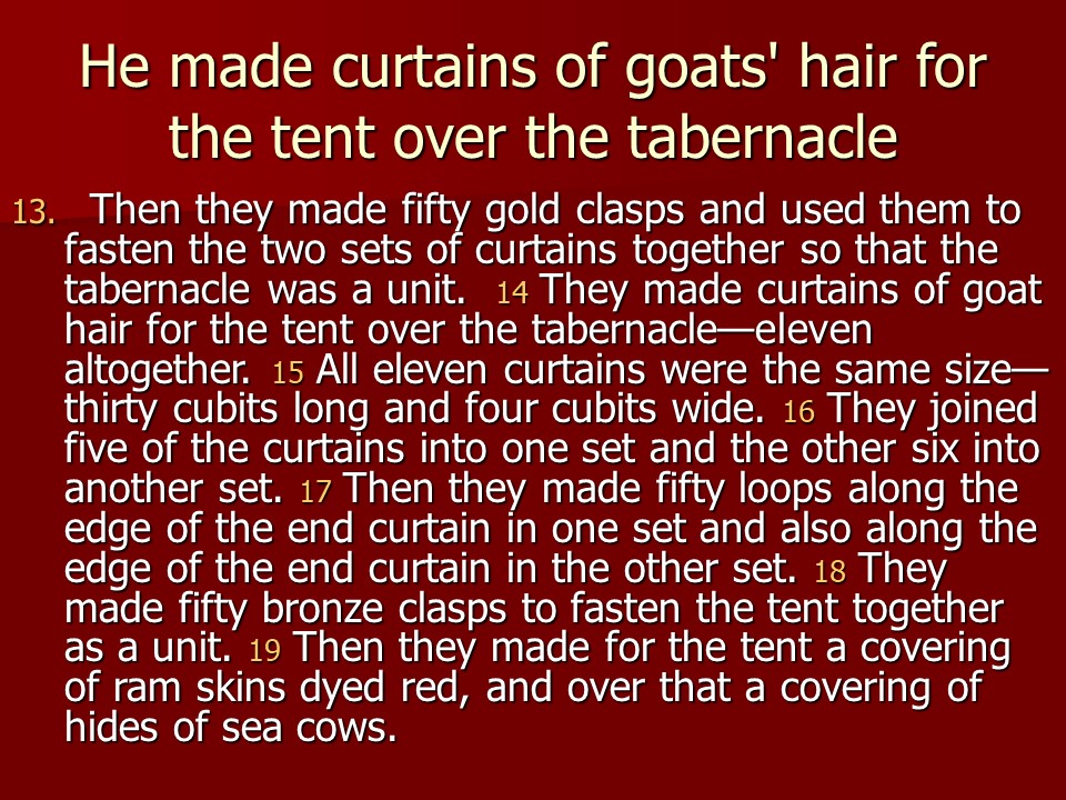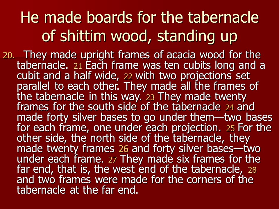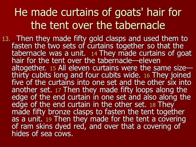 Exodus 36, the Tabernacle. Exodus 36, the Tabernacle. The choices of good wood are limited in the desert