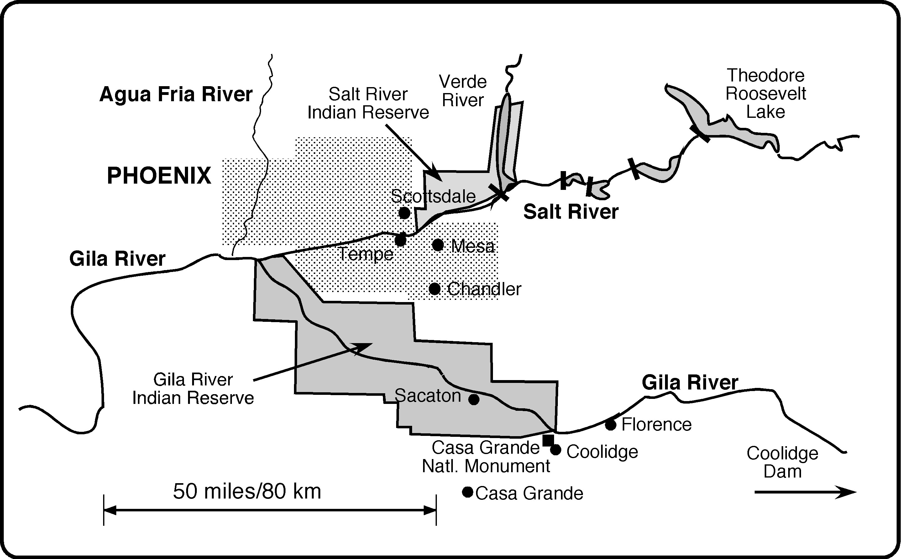 The home of the Gila River Indian Community The Salt and Gila Rivers flow east to west. Present day dams that divert the Salt River into a series of canals are indicated. Roosevelt Dam was completed in 1911, creating Theodore Roosevelt Lake, and Coolidge Dam was completed in 1930. Important locations include the Casa Grande structure, an artifact of the Hohokam times, and the city of Florence, site of the Florence Canal, which is described in the text. The Gila Indians today live on the Reserve shown, with headquarters at Sacaton. The related Salt River Pima-Maricopa Indians live on a separate reserve on the Salt.