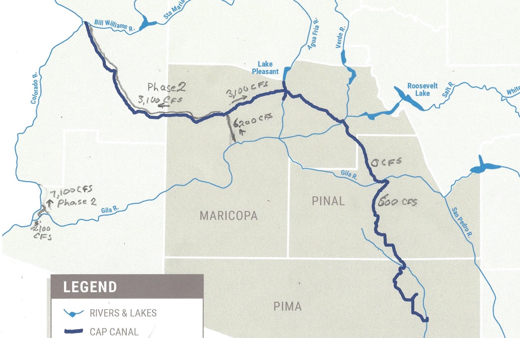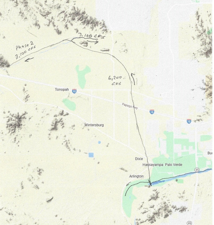 In Phase 1, the Gila River will free flow. In Phase 2 there will be a55 mile aqueduct thru the Indian reserve dimensioned for 10,000 cfs flow. It will provide some power with a drop of over 400 feet. The maps will look like this: