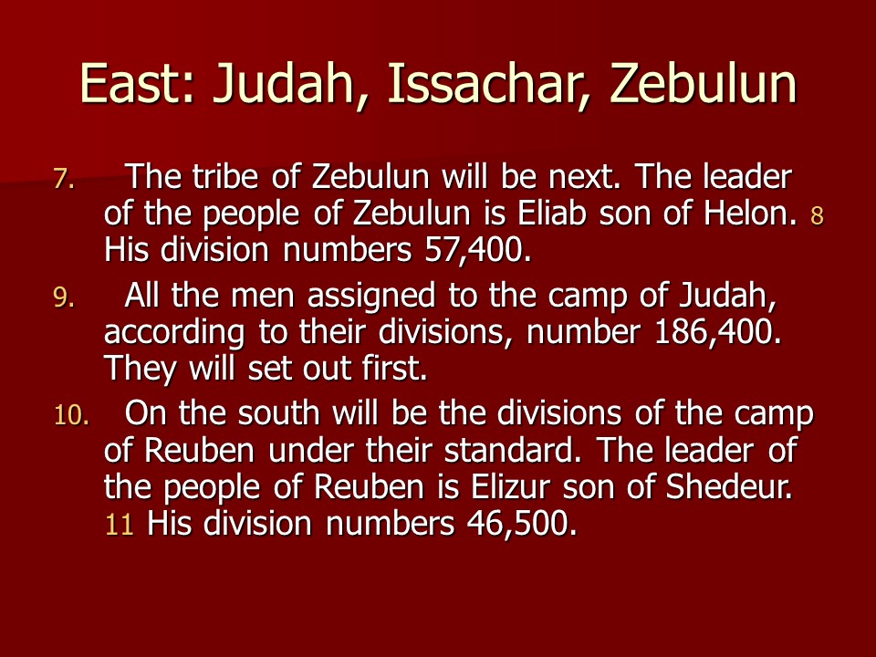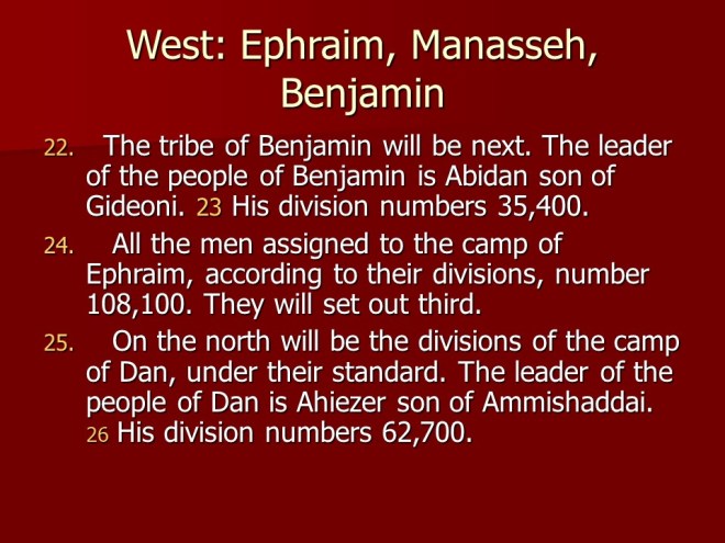 Numbers 2 tells how the tribes were to be arranged around the tabernacle, three to the east, three to the south, three to the west and three to the north and the Levites in the middle.
