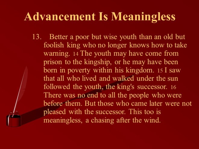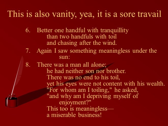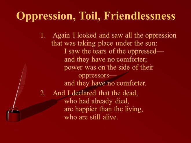 Ecclesiastes 4. There is oppression but no comforter, there is vanity of selfish toil. There is value in having friends “a cord of three strands is not quickly broken,” yet, popularity passes away.