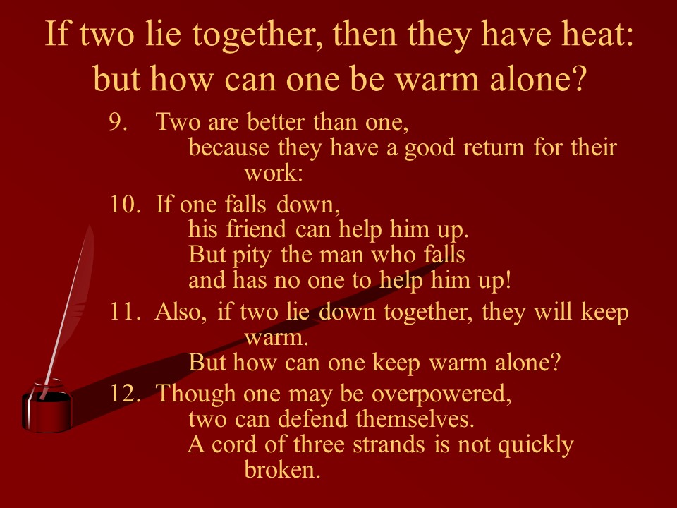 Ecclesiastes 4. There is oppression but no comforter, there is vanity of selfish toil. There is value in having friends “a cord of three strands is not quickly broken,” yet, popularity passes away.