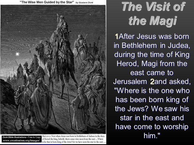 Matthew 2:1-12 . We get to read about the Magi (probably about 15 of them including servants) who came to Jerusalem to ask about the King of the Jews. This worried King Herod and all Jerusalem, and Herod asked the Scribes and the learned men where he was to be born. They answered “In Bethlehem of Judea”, but were otherwise remarkably uninterested. The wise men went to Jesus (he is by now at least a few months old), but did not report back to Herod, instead they returned another way.