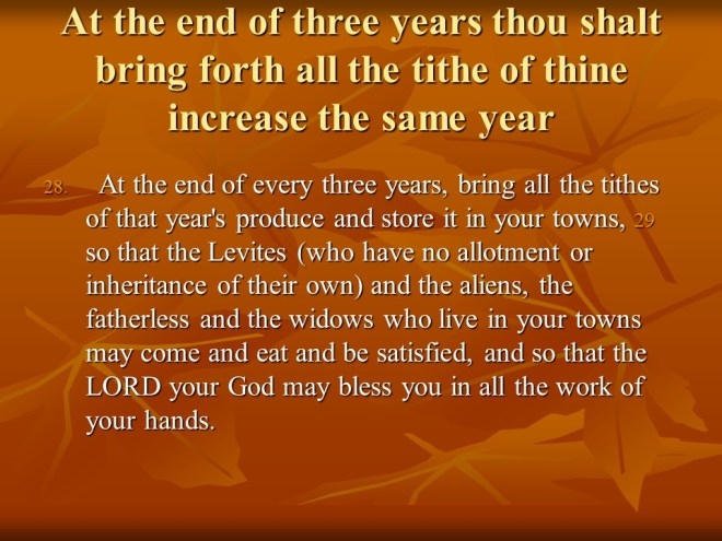 Deuteronomy14. Do not do as the heathen do with improper mourning, eat only clean meat and do not boil a young goat in its mother’s milk. Observe tithing, and every three years give an extra tithing for the Levites, the aliens, the fatherless and the widows.
