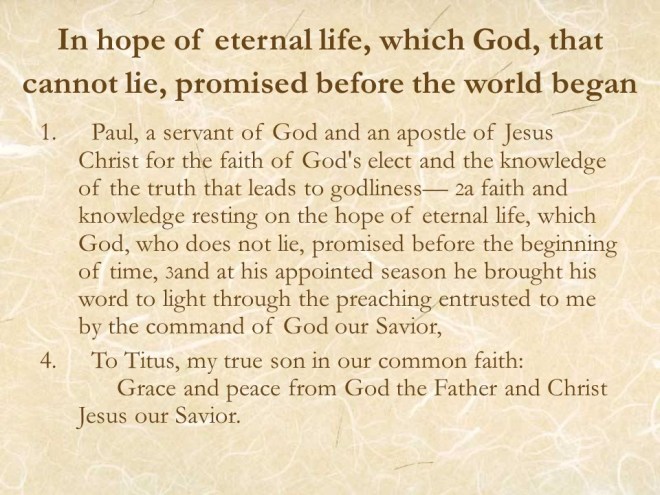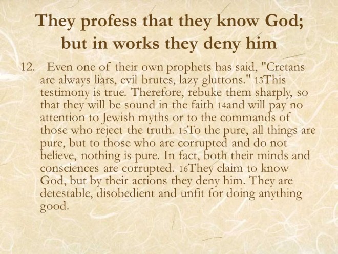 Titus 1. After the customary greeting, the Apostle Paul instructed Titus to appoint elders and listed the qualifications for elders and their duties. Be careful, some Cretans are corrupt!