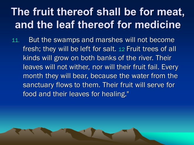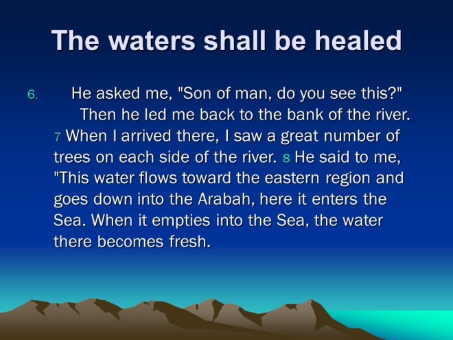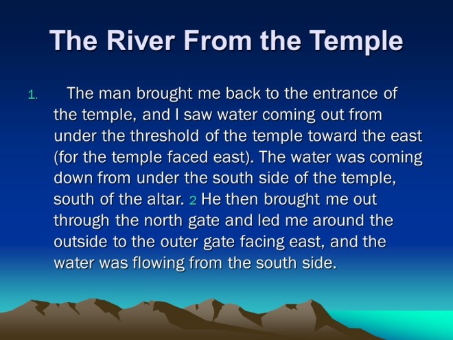 Ezekiel 47. This chapter is interesting. It tells of the river from the temple, the healing waters, trees by the river and the borders of the land.