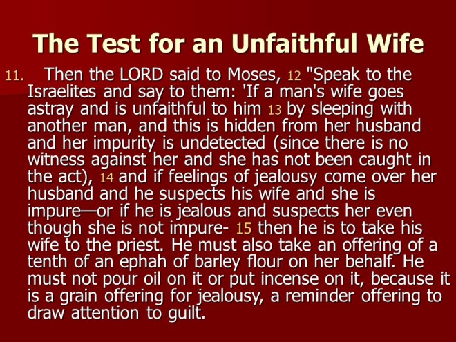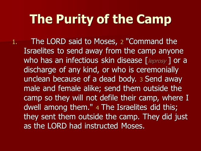 Numbers 5 deals with purity, how to deal with leprosy or dead bodies, restitution for wrongdoings and how to deal with marital unfaithfulness, especially for women.