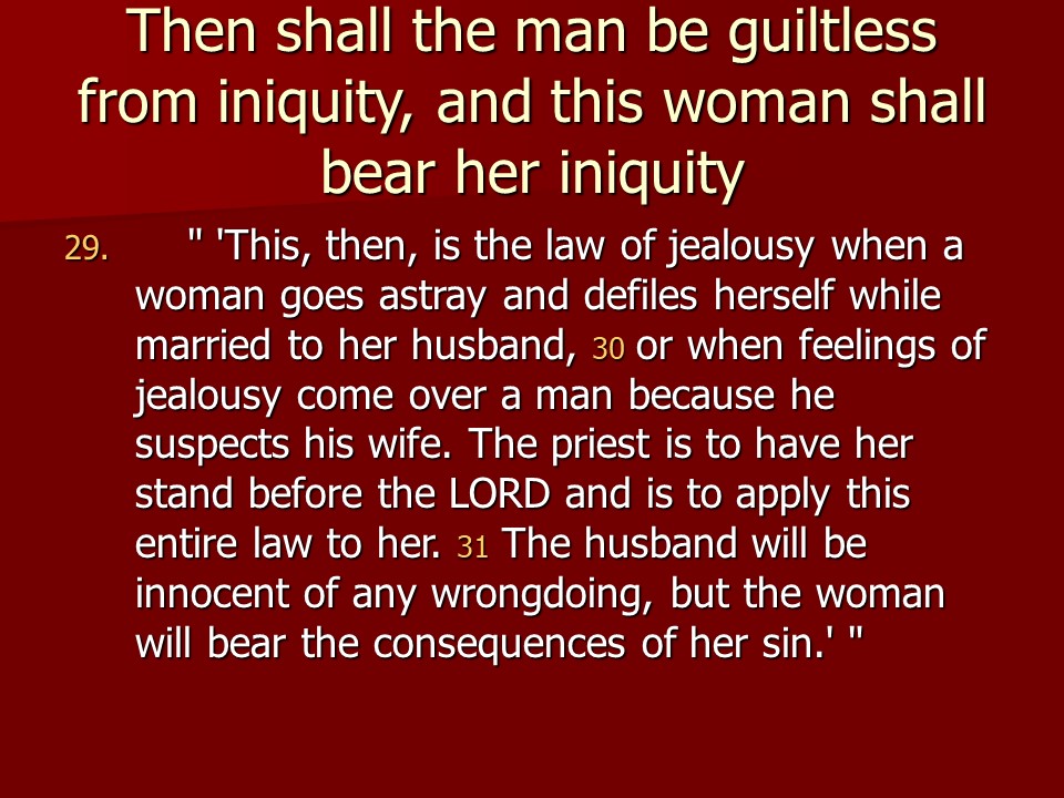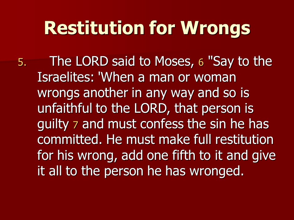 Numbers 5 deals with purity, how to deal with leprosy or dead bodies, restitution for wrongdoings and how to deal with marital unfaithfulness, especially for women.