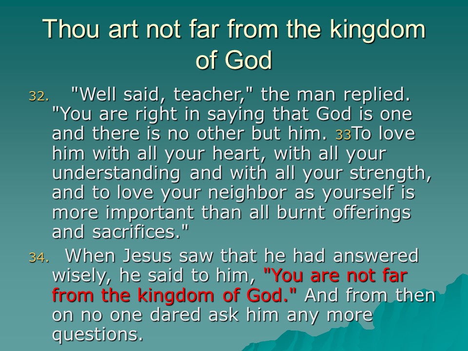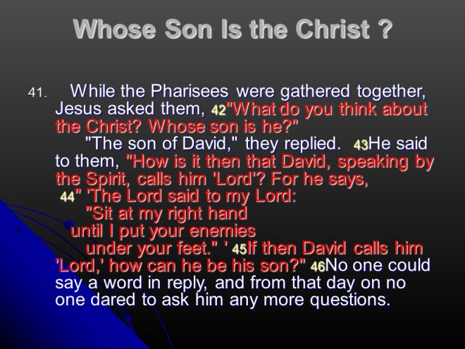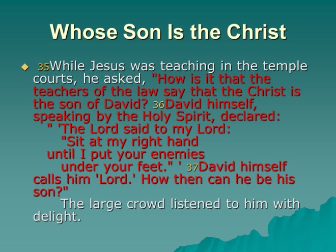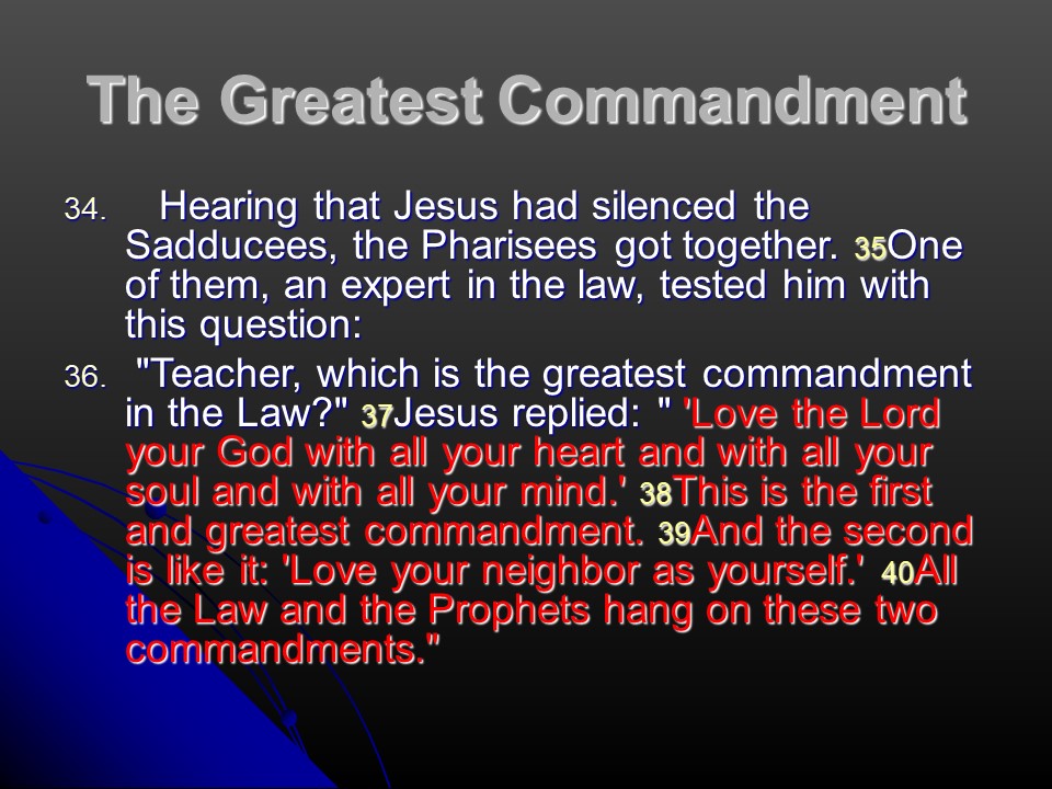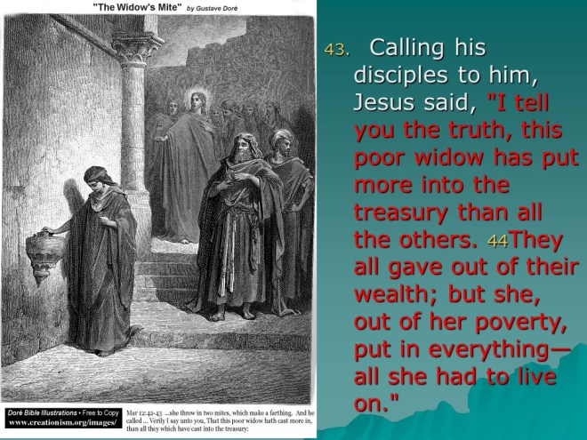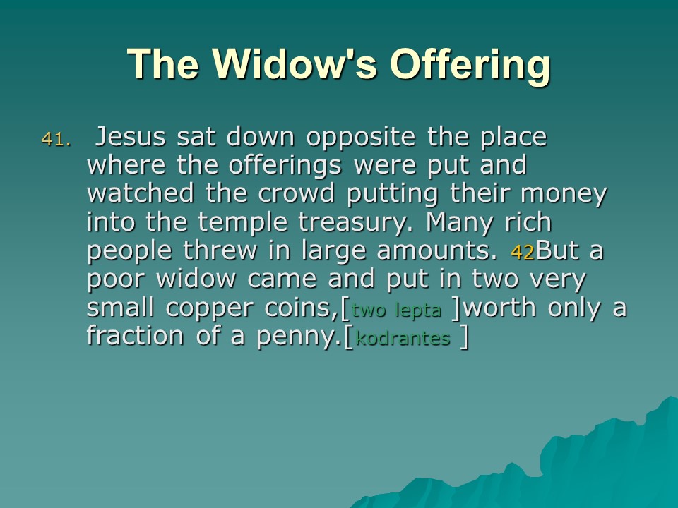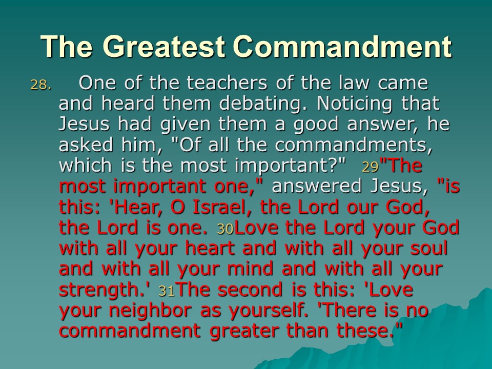Mark 12:28-44. Jesus answered the question: “What is the Greatest Commandment?” He then gave the people the riddle “whose son is the Christ?” Finally, looking at temple offerings Jesus noticed the widow that gave all she had, two mites.