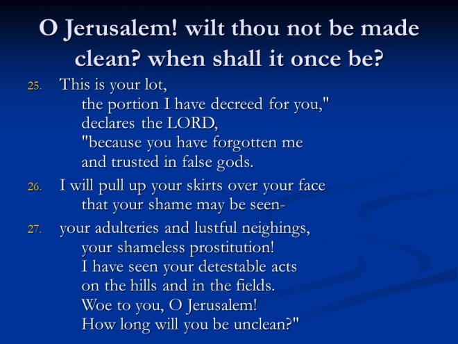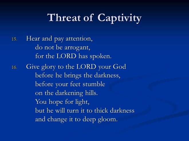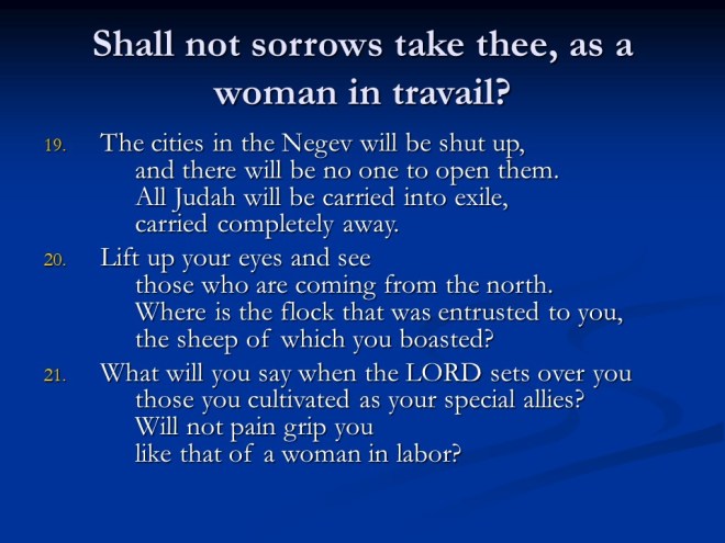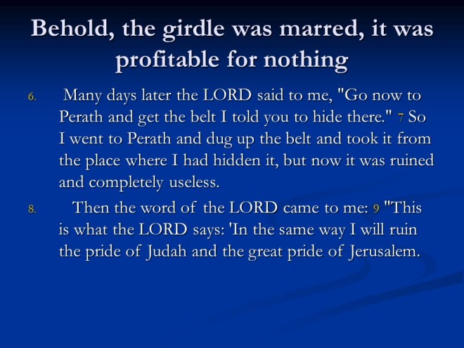 Jeremiah 13. Jeremiah bought a linen belt, it got ruined. Then God told about wineskins. Both were object lessons for what was to befall Jerusalem, for pride precedes captivity.
