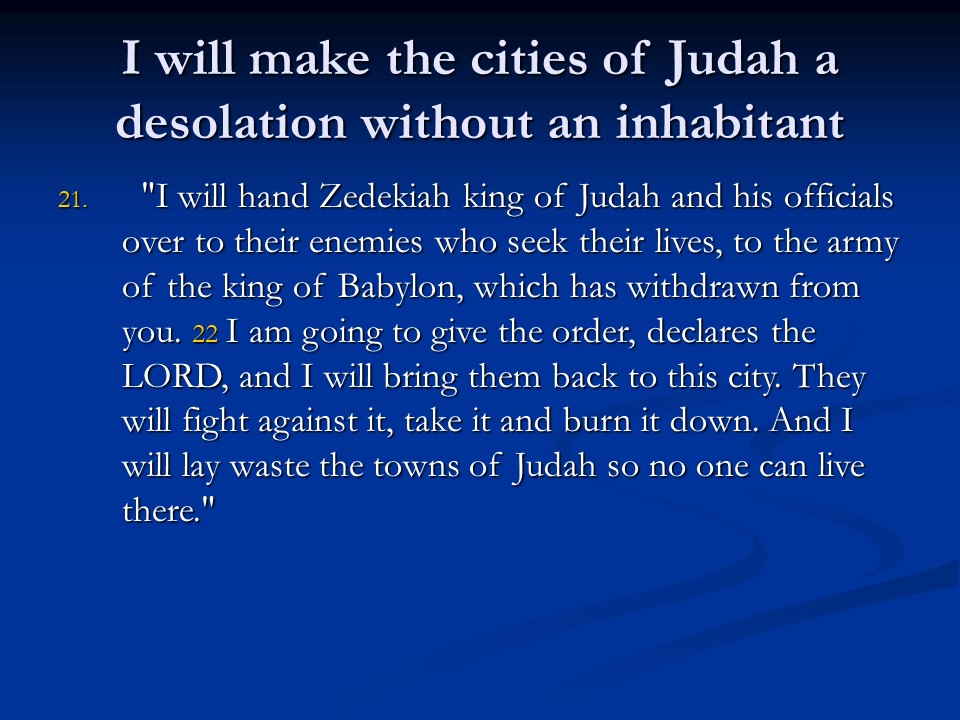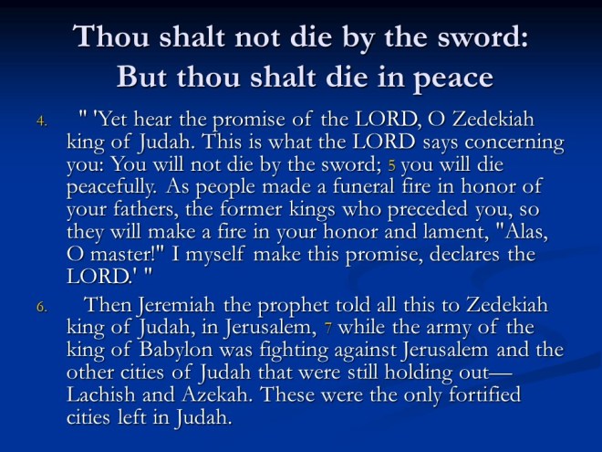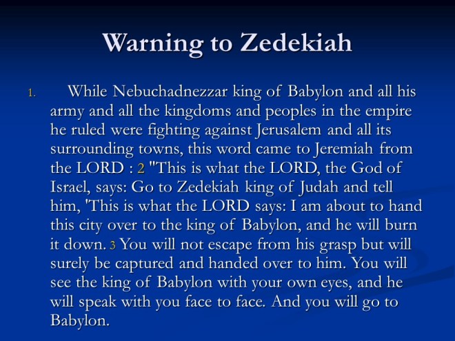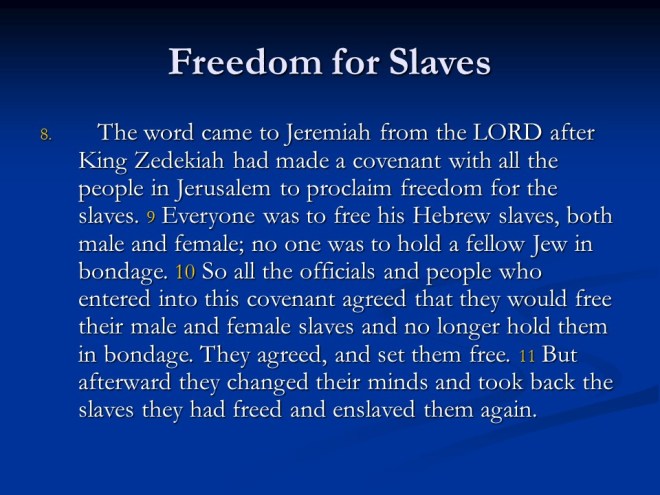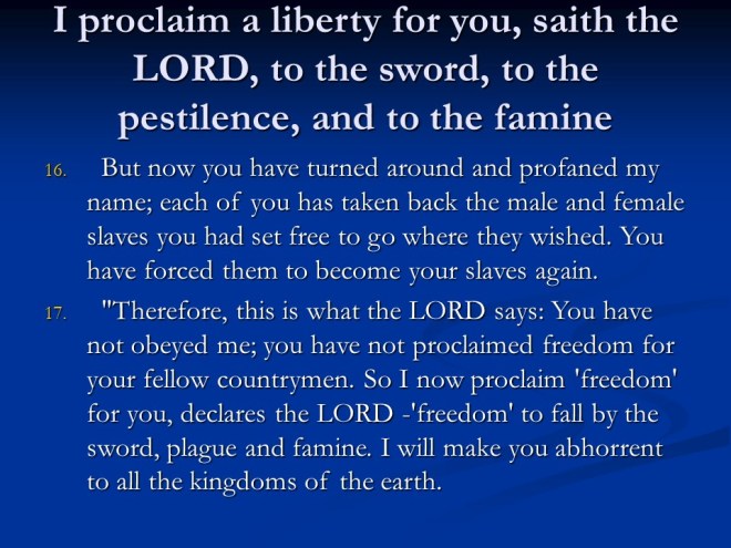 Jeremiah 34. Zedekiah was warned by God to give liberty to the slaves, as commanded by Him, but the slaves were not freed, so bad things were going to happen.